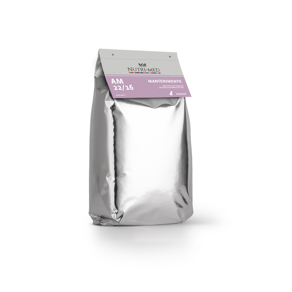 Crocchette AM 22/16 Mantenimento Premium Nutri-Med. Alimento completo e bilanciato indicato per cani adulti di tutte le taglie sottoposti ad una normale attività fisica. Arricchito con acidi grassi Omega 3 e Omega 6, costituenti fondamentali delle membrane cellulari, che garantiscono la salute di cute e mantello, e colina cloruro che favorisce l’assimilazione dei grassi e ne previene l’eccesso dei depositi nel fegato. Il processo di lavorazione, che prevede tempi di cottura diversi per ciascuna materia prima, assicura un’elevata digeribilità degli amidi. Le proteine, le vitamine e le sostanze minerali vengono aggiunte a freddo, mantenendo così inalterate tutte le loro proprietà